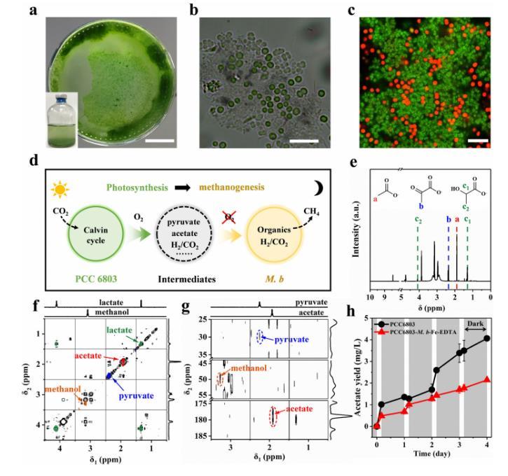 圖3、共培養(yǎng)生物膜和產(chǎn)生的有機(jī)物質(zhì)的特征化。a培養(yǎng)瓶中的密集生物膜(插圖顯示了培養(yǎng)瓶的圖片)。b光學(xué)顯微鏡圖像和c FISH圖像,使用M.b(綠色熒光探針)和PCC6803(紅色,自體熒光);代表10幅圖像。d生物甲烷生成的示意圖,通過PCC6803-M.b-Fe-EDTA驅(qū)動的中間產(chǎn)物。e通過ROS氧化生成的可能有機(jī)物質(zhì)。f gCOSY(f)和gHMBC(g)重疊的水溶液600-MHz NMR光譜,分別為共培養(yǎng)6天后的上清液(黑色),0.1 M乳酸(綠色),0.1 M醋酸(紅色),0.1 M丙酮酸(藍(lán)色),和0.1 M甲醇(橙黃色)。在(g)中的紅色圓圈峰歸屬于醋酸,藍(lán)色圓圈峰歸屬于丙酮酸,橙黃色圓圈峰歸屬于甲醇。h在4小時-20小時的光-暗周期下醋酸濃度的變化。灰色區(qū)域表示黑暗期。數(shù)據(jù)以平均值±標(biāo)準(zhǔn)差表示,來自n=3次獨(dú)立實(shí)驗(yàn)。比例尺:a為1μm,b為10μm,c為10μm。