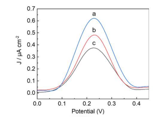 接下來,采用高靈敏度的差分脈沖伏安法(DPV)追蹤修飾過程。如圖4所示,在aCSF溶液(pH 7.4)中,SAC修飾的AuS/CFME在0.22 V(vs.Ag/AgCl)處出現陽極峰,歸因于Fc氧化為Fc?。Fc/Fc?的陽極電流信號強烈依賴于鏈長,SAC電極電流響應最大(曲線a),但隨著適配體鏈長的增加,電流響應逐漸減小(曲線b和c)。這些結果表明,較長的適配體修飾鏈導致Fc/Fc?與電極表面距離增加,從而減弱電流響應。