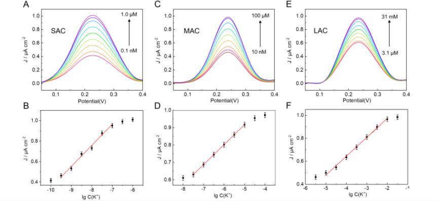 隨后,在不同K?濃度溶液中獲取不同適配體電極的DPV曲線。如圖5所示,SAC電極的峰值電流密度(Jp)隨K?濃度增加而逐漸增大。MAC和LAC電極也觀察到類似的電流隨K?濃度增加的趨勢。然而,三種適配體微電極對K?濃度的線性響應范圍不同:SAC為0.3 nmol·L?1–100 nmol·L?1(圖4B),MAC為3.0 nmol·L?1–10μmol·L?1(圖4D),LAC為10μmol·L?1–10 mmol·L?1(圖4F)。這些結果表明,適配體電極的響應強烈依賴于K?濃度,增加適配體鏈長可合理調節電化學傳感器對更高濃度水平的靈敏度。由于腦細胞外K?基礎濃度約為2.6 mmol·L?1,最終優化選擇LAC作為電化學傳感器用于活體腦內K?檢測。