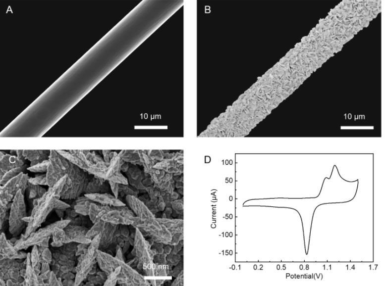 選擇具有良好導電性和生物相容性的碳纖維作為基底制備功能化微電極(CFME)(圖1A)。通過原位電沉積在CFME表面形成致密金微片(記為AuS/CFME)(圖1B和C)。在0.01 mol·L?1H?SO?中,AuS/CFME的循環伏安(CV)曲線在約0.9 V(vs.Ag/AgCl)處出現還原峰(圖1D),可用于計算電荷消耗量。電極的電化學活性面積可通過以下公式估算: