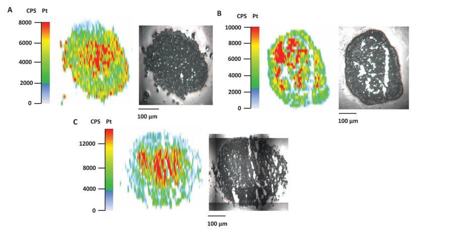 圖4、用(A)化合物1、(B)化合物2和(C)飽和鉑處理缺氧HT1080球體內的鉑分布。使用20毫米薄的冷凍切片進行ICP-MS測量。