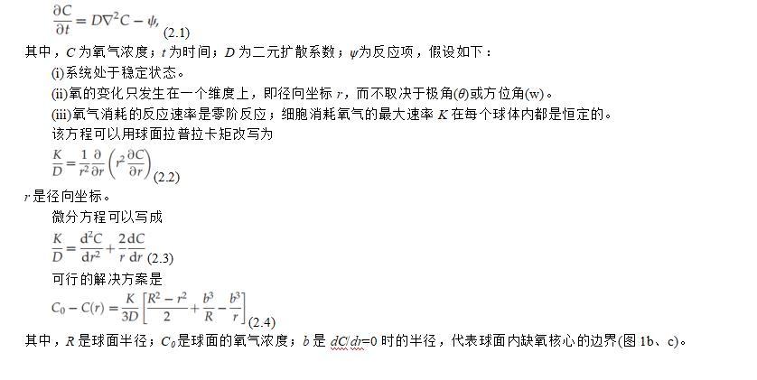 其中,R是球面半徑;C0是球面的氧氣濃度;b是dC/dr=0時的半徑,代表球面內缺氧核心的邊界(圖1b、c)。