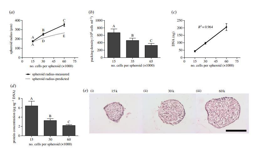 圖2球粒堆積密度隨著球粒尺寸的增大而減小。(a)計(jì)算了假設(shè)最大堆積密度的預(yù)測(cè)球面半徑,并與測(cè)量的球面半徑一起報(bào)告。(b)隨著球面尺寸的增大,堆積密度明顯降低。(c)DNA含量隨每個(gè)球形體細(xì)胞數(shù)的增加而線性增加。(d)歸一化蛋白質(zhì)含量隨著球形體大小的增加而減少。(e)H&E染色顯示,15000細(xì)胞球體(i)比較大的30000細(xì)胞球體(ii)和60000細(xì)胞球體(iii)更緊湊。標(biāo)尺條代表250μm。