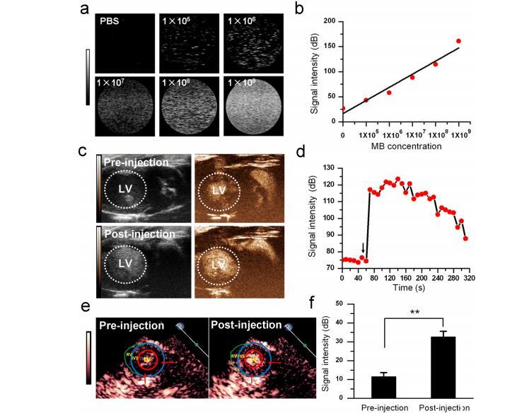 圖2.H2-MBs的超聲信號檢測。(a)H2-MBs分散在各種濃度(5×105、5×106、5×107、5×108和5×109/mL)的PBS中的超聲圖像。使用Vevo 2100超聲成像系統(tǒng)進行成像。(b)PBS中H2-MBs的超聲信號強度的定量分析。(c)大鼠心臟LV中H2-MBs在靜脈尾部注射H2-MBs前后的超聲圖像。使用Vevo 2100超聲成像系統(tǒng)進行成像(n=3)。上排,注射H2-MBs前;下排,注射H2-MBs后;左側面,B模式圖像;右側面,對比模式圖像;LV,左心室(點線循環(huán))。(d)H2-MBs注射進入大鼠后300秒的時間-強度曲線。箭頭表示MB注射的時間。(e)大鼠心肌組織中H2-MB輸送的超聲圖像。使用Philips IE33超聲機進行成像。左側,注射H2-MBs前;右側,注射H2-MBs后;LV,左心室(紅色循環(huán));IVS,心室間隔(藍色循環(huán));RV,右心室(綠色循環(huán))。箭頭表示靜脈注射H2-MBs后H2-MB輸送到大鼠心肌組織中的情況。(f)H2-MBs的超聲信號強度的定量分析(n=3)。**P<0.01。數(shù)據表示平均值±s.d.