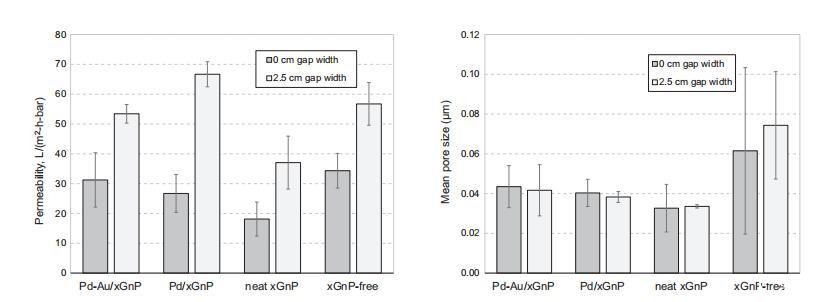 無填料、xGnP填充、Pd/xGnP填充和Pd-Au/xGnP填充膜的滲透性隨著間隙寬度從0 cm增加到2.5 cm,分別從34.3增加到56.7、從18.1增加到37.0、從26.7增加到66.7和從31.2增加到53.4(L.m-2.h-1.bar-1)(圖4)。