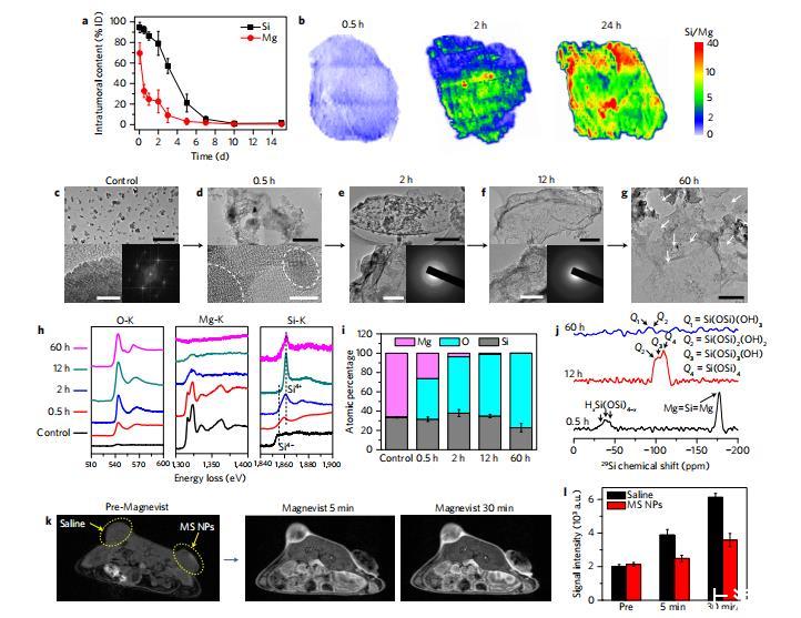 從更微觀的角度來看,時間序列TEM圖像和電子能損耗譜(EELS)顯示,瘤內Mg2Si晶體納米顆粒逐步轉變?yōu)闊o定形微片。這種轉變伴隨著顯著的氧捕獲和鎂消除,更明顯的是,硅的價態(tài)從-4急劇逆轉為+4(圖6c-i)。根據(jù)29Si固態(tài)魔角旋轉核磁共振(MASNMR)結果(圖6j),發(fā)現(xiàn)最初的脫氧產(chǎn)物是不飽和HxSi(OSi)4-x物種,即包裹結晶MSNP的無定形物質(圖6d)。正如定義明確的Q2和Q3物種所示,這些中間產(chǎn)物被進一步氧化并凝結成富含硅醇基團的SiO2微片。這一發(fā)現(xiàn)顯然證實了組織內SiO2微片形成的溫和、逐步脫水-縮合機制,從而使這些動態(tài)生成的聚集體成為有效的腫瘤毛細血管阻斷劑,阻止紅細胞的循環(huán)。