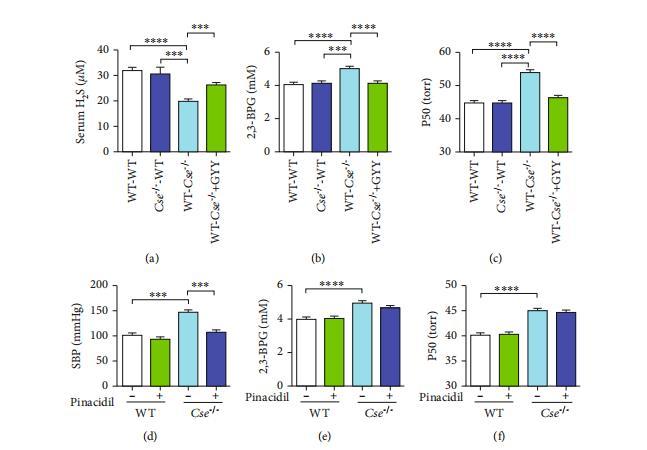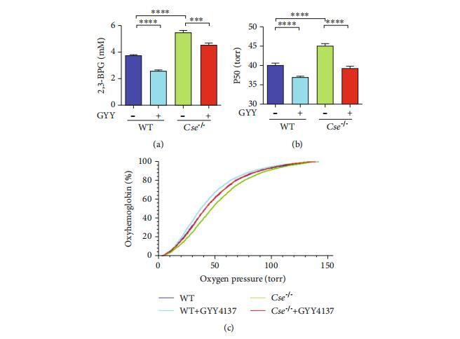 圖1:硫化氫水平降低導(dǎo)致Cse-/-小鼠紅細(xì)胞中2,3-BPG生成增加和Hb-O2親和力下降。野生型和Cse-/-小鼠分別給予生理鹽水或GYY4137(133μmol/kg)。(a–c)注射24小時(shí)后分離紅細(xì)胞以測定2,3-BPG水平(a)和氧解離曲線((b)P50值;(c)氧解離曲線的代表性跡線)。數(shù)據(jù)以均值±標(biāo)準(zhǔn)誤表示(n=10)。***p<0.001,*****p<0.0001。