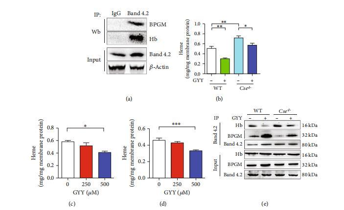 因此,這可能表明血紅蛋白和BPGM通過與帶3巨復合體相互作用而錨定于膜。其次,我們通過測量紅細胞膜中的血紅素含量來確定膜錨定血紅蛋白。根據Cse-/-小鼠中BPGM從細胞膜釋放的實驗結果,Cse-/-小鼠紅細胞的膜血紅素含量顯著升高,但經GYY4137處理后該現象得到逆轉(圖6(b))。在小鼠和人類紅細胞培養實驗中,GYY4137處理同樣降低了膜血紅素含量(圖6(c)和6(d))。進一步研究發現,Cse-/-小鼠紅細胞中,帶4.2蛋白與血紅蛋白(Hb)的結合量增加,而與BPGM的結合量減少。GYY4137處理后,帶4.2蛋白與Hb的結合量下降,同時與BPGM的結合量有所增加。