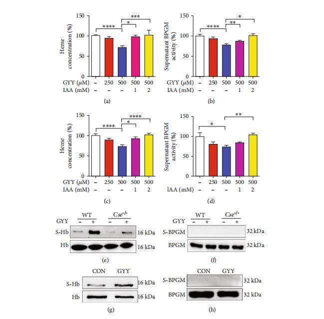 圖7:硫化氫對Hb和BPGM轉運的調節作用及S-硫水合在這些過程中的作用。(a–d)硫化氫和碘乙酰胺對小鼠和人紅細胞鬼膜中Hb與膜結合及BPGM從膜釋放的影響。小鼠紅細胞膜鬼膜經Hb和不同濃度的GYY4137處理(存在或不存在碘乙酰胺(IAM))后,Hb與膜結合(a)和BPGM從膜釋放到細胞質(b)。人紅細胞膜鬼膜經Hb和不同濃度的GYY4137處理(存在或不存在碘乙酰胺(IAM))后,Hb與膜結合(c)和BPGM從膜釋放到細胞質(d)。數據以均值±標準誤表示(n=8)。*p<0.05,**p<0.01,***p<0.001,****p<0.0001。(e,f)野生型和Cse-/-小鼠紅細胞中Hb和BPGM S-硫水合的代表性圖像。野生型和Cse-/-小鼠分別給予生理鹽水或GYY4137(50 mg/kg)。治療24小時后采集血樣。使用生物素開關技術分離紅細胞,以測定Hb(e)和BPGM(f)的S-硫水合。(g,h)培養人紅細胞中Hb和BPGM S-硫水合的代表性圖像。分離的人紅細胞經GYY4137(500μM)處理6小時后,收集用于測定Hb(g)和BPGM(h)的S-硫水合。