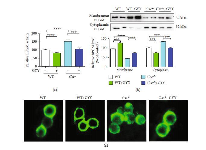 圖4:硫化氫對紅細胞膜與細胞質間BPGM轉運的影響。野生型(WT)和Cse-/-小鼠分別給予生理鹽水或GYY4137(50 mg/kg)。處理24小時后采集血樣。分離紅細胞以測定胞質BPGM活性及膜與胞質BPGM水平,并進行BPGM免疫熒光染色。(a)WT和Cse-/-小鼠紅細胞胞質BPGM活性(有無GYY4137處理)。數據以均值±標準誤表示(n=10)。(b)WT和Cse-/-小鼠紅細胞膜與胞質BPGM水平(有無GYY4137處理)。數據以均值±標準誤表示(n=6)。(c)WT和Cse-/-小鼠紅細胞BPGM染色代表性圖像(有無GYY4137處理)。***p<0.001,*****p<0.0001