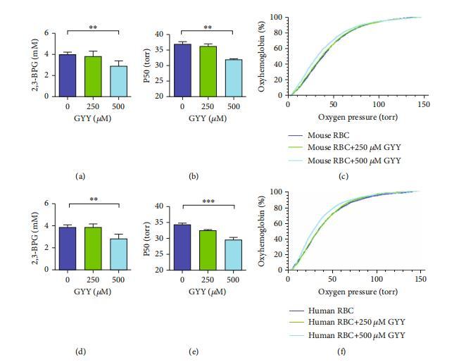研究表明,KATP通道開放劑如pinacidil可降低Cse-/--小鼠的血壓。為了確定Cse-/--小鼠中2,3-BPG生成和Hb-O2親和力的變化是否與高血壓相關,我們檢測了pinacidil處理對Cse-/--小鼠紅細胞中2,3-BPG生成和P50的影響。如圖2(d)–2(f)所示,pinacidil處理顯著降低了Cse-/--小鼠的血壓,但未影響其紅細胞中2,3-BPG的生成和Hb-O2親和力。上述數據表明,Cse-/--小鼠中2,3-BPG和P50水平的升高與高血壓無關。接下來,我們測試了硫化氫對野生型小鼠和人類紅細胞中2,3-BPG生成及血紅蛋白氧親和力的直接影響。如圖3(a)-3(c)所示,用硫化氫供體GYY4137(500μM)處理分離的小鼠紅細胞后,細胞內的2,3-BPG濃度降低,氧解離曲線左移,P50水平下降。在分離的人類紅細胞中也觀察到GYY4137對2,3-BPG生成和P50水平的類似影響(圖3(d)-3(f))。此外,我們發現GYY4137處理對小鼠和人類血紅蛋白的P50水平無顯著影響。上述數據表明,硫化氫通過作用于紅細胞而非血紅蛋白來降低2,3-BPG生成,從而增強血紅蛋白-氧親和力。
