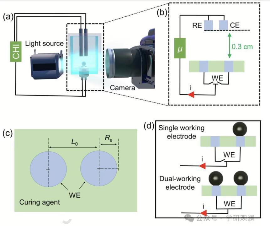 水分解實驗在一個定制的透明電解池中進行,其中采用包含鉑工作/陰極電極、鉑對/陽極電極和參比甘汞電極的三電極配置,以消除由極化效應(yīng)引起的電極電位誤差,如圖1(a)和圖S1所示。該水電解系統(tǒng)相應(yīng)的工作電路如圖1(b)所示。陰極電極由兩個半徑為R的圓形微電極組成,如圖1(c)所示,其中心距d在2R到2000 μm之間變化。使用商用三維共聚焦顯微鏡測量這些鉑微電極的算術(shù)平均粗糙度為Ra ≈ 0.8 μm(圖S2)。在每次測試中,首先將50 mL的0.5 M硫酸水溶液(表面張力為72 mN/m)注入電解池,然后在工作和參比電極之間施加電勢E。研究了兩種電極工作模式——即單工作電極模式(即僅操作一個微電極)和雙工作電極模式(即同時操作兩個微電極)——它們的工作電路示意圖如圖1(d)所示。使用電化學工作站(CHI660E,CH Instruments Inc.,美國)以1000 Hz的數(shù)據(jù)采集頻率監(jiān)測液體電路中產(chǎn)生的電信號;同時,通過高速相機(Phantom v2012,Vision Research Inc.,美國)以每秒1000幀的采集速率和10 μs的快門速度從側(cè)視圖記錄工作陰極微電極上的氫氣泡演變,其中使用LED光源(上海昭基電子科技有限公司)從透明電解池的背面照射工作微電極周圍的區(qū)域。成像系統(tǒng)的空間分辨率測定為2.76 μm/pixel。我們進一步通過倒置顯微鏡(Nikon DIAPHOT 300,日本)下的40倍物鏡使用高速相機觀察了氣泡成核和生長的早期動力學,提供了0.345 μm/pixel的空間分辨率。該測量中的光源是熒光燈,并采用綠光(波長為532 nm)進行照明。每個測試至少重復(fù)3次以確保其可重復(fù)性,數(shù)據(jù)以獨立測量的平均值±標準差表示。記錄的視頻使用自定義編程的Python代碼進行處理。更具體地說,獲取的彩色圖像首先轉(zhuǎn)換為灰度圖像,然后使用Sobel和Canny算子檢測氣泡層和大氣泡的邊緣,從而確定它們的特征參數(shù)(例如,氣泡層的體積和氣泡半徑)。