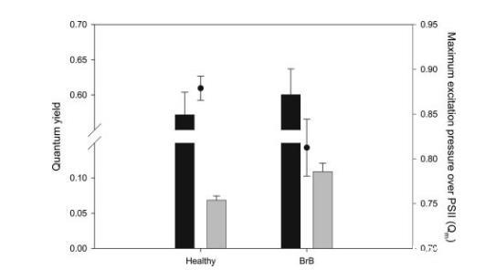 健康和褐帶組織之間的Fv/Fm沒有顯著差異,表明PSII活性沒有因纖毛蟲攝入而受到抑制。實際上,光利用效率,以有效PSII量子產量ΔF/Fm'為特征,顯然在與纖毛蟲關聯的蟲黃藻中增加了。