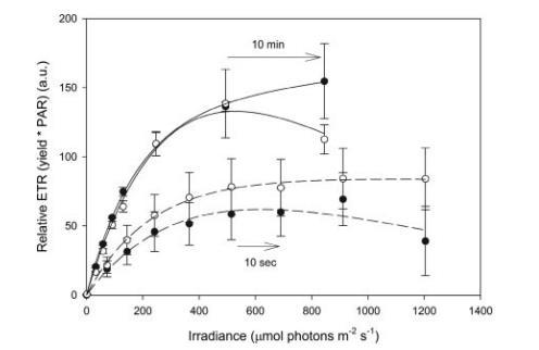 基于一種新穎的方法學方法,我們表明纖毛蟲內的蟲黃藻具有光合能力。雖然氧氣和可變葉綠素a熒光的微電極先前已分別用于研究蟲黃藻在宿主內光合作用的異質性,但本研究首次提供了PSII量子產量和衍生的rETR測量值與穩態O2濃度、O2通量速率以及患病珊瑚組織中的總光合作用的聯合測量。我們對從患病珊瑚獲得的RLCs和SSLCs的比較也是新穎的。我們的結果表明,SSLCs不同于RLCs,后者在每個輻照度水平之間僅延遲10至20秒。很明顯,如果蟲黃藻被允許在每個輻照度水平適應延長一段時間,它們的光合性能會產生更高的rETR值。因此,使用PAM儀器獲得的熒光衍生光曲線取決于先前的光照暴露。