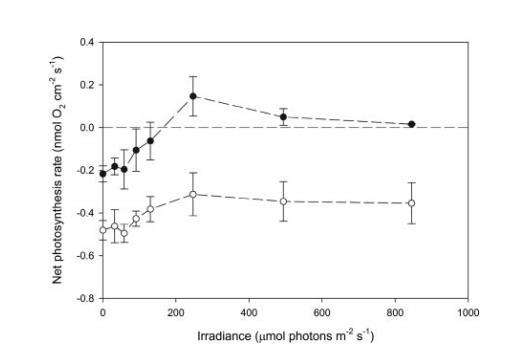 高光照強度下,蟲黃藻的光合作用活動明顯緩解了這一限制。對棕色帶組織的氧通量計算顯示存在凈氧攝取量,這表明在所有實驗輻照度條件下,呼吸作用強度均高于總光合作用(圖7)。由于高遷移率且密集的纖毛蟲群落存在,棕色帶組織表面的氧濃度呈現波動,導致我們的氧分布曲線存在顯著差異。此外,微電極可能引發的邊界層壓縮效應,也可能影響氧分布曲線及由此推導的氧通量。值得注意的是,先前研究已證實纖毛蟲高密度分布會影響局部物質運輸過程。