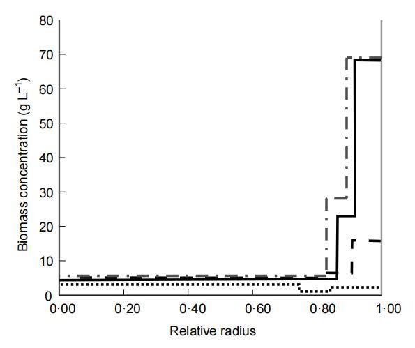 固定化細(xì)菌從鈣藻酸鹽珠的釋放與細(xì)菌在珠中的生長相關(guān)。隨著細(xì)菌生長,珠中生物量分布發(fā)生變化。為了研究這些變化,包含固定化L.lactis亞種lactis NCIMB 6681的珠在控制pH 6.5下連續(xù)發(fā)酵,并在不同發(fā)酵時間收獲進(jìn)行生物量分布分析。珠在開始和連續(xù)發(fā)酵5.5、12和48小時后的生物量分布如圖1所示。