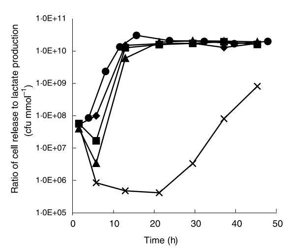 為了確定觀察到的細(xì)胞釋放減少是否實(shí)際由于減少細(xì)胞釋放而非僅代謝活性降低的后果,細(xì)胞釋放速率與乳酸生產(chǎn)速率的比值在發(fā)酵期間間隔如圖6所示。