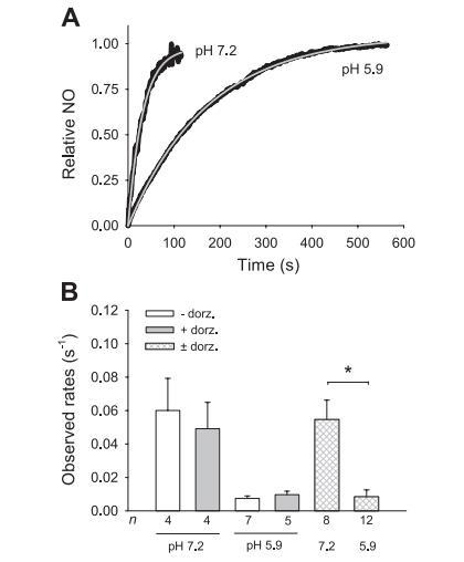 觀察到的速率明顯受到pH值的影響,但不受多佐胺的影響(圖2B),根據單指數擬合得到的值計算得出的表觀速率常數(平均±SE)為:pH值為7.2時547±116/M/s,pH值為5.9時84±42/M/s(圖2B)。由于pH值為7.2時反應的半衰期(t1/2,~13秒)與電極的反應時間(~10秒)相當,因此該pH值下的反應速率快于~547/M/s。