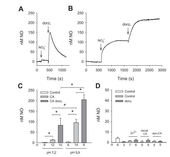 使用微型一氧化氮電極來檢測在沒有和有純化CA(100μM)的情況下,在通氣磷酸鹽緩沖溶液中加入KNO2(100μM)后的NO產生情況(圖1A和B)。我們選擇的pH值分別為7.2和5.9,因為它們分別定義了缺血5-10分鐘后從正常細胞內pH到組織pH的范圍。