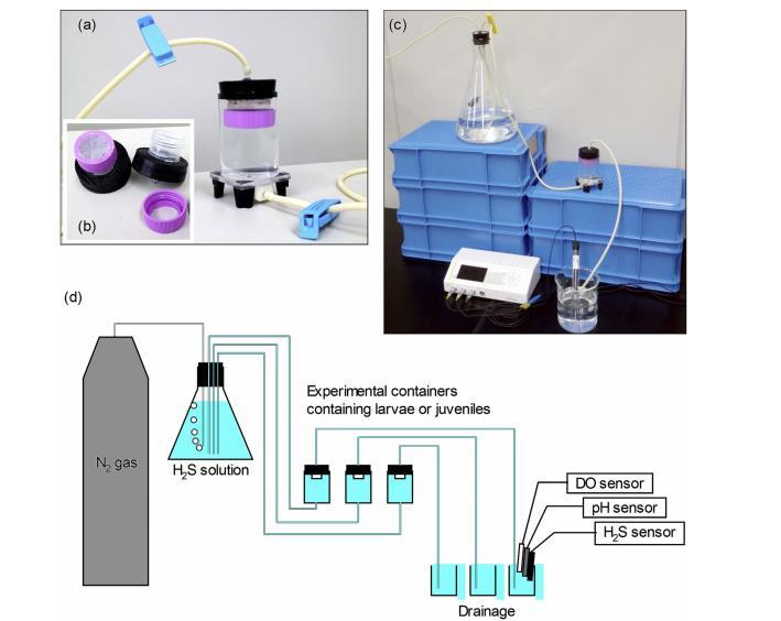 圖2. 實驗裝置圖。(a) 使用橡膠塞密封并通過PharMed管與系統連接的實驗容器。通過夾住管子停止水流,在靜態條件下進行暴露實驗。(b) 附著在橡膠塞底部的覆蓋網,用于防止幼蟲和稚貝在暴露實驗期間從密封的實驗容器中逃逸。(c) 實驗系統,包括一個盛有常氧水或含/不含H?S的低氧水的5升燒瓶。這些溶液通過虹吸效應從燒瓶經管子輸送到裝有幼蟲或稚貝的實驗容器中。每個實驗容器的排水被收集在燒杯中。圖中亦顯示了Unisense硫化氫(H?S)微傳感器。(d) 實驗系統示意圖。實驗容器中的水質通過測試燒杯中的水(在實驗開始時,即水交換剛結束后)或直接測試實驗容器中的水(在實驗結束時)使用溶解氧(DO)、pH和H?S傳感器進行測量。