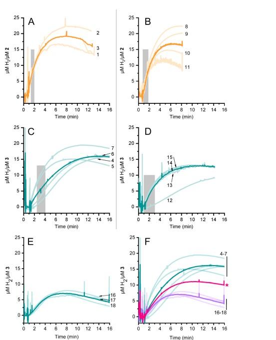 圖5、通過克拉克型氫傳感器檢測(cè)到的化學(xué)式氫析出現(xiàn)象。氫氣在化學(xué)還原劑[Eu(EGTA)]2-的存在下由2和3發(fā)生演變。亮色痕跡是單獨(dú)的測(cè)量值;暗色痕跡則是重復(fù)測(cè)量的平均值。1至15號(hào)痕跡是在同一天記錄的,因此更具可比性。16至18號(hào)痕跡是在另一天記錄的。數(shù)字與表S1中的樣本編號(hào)相對(duì)應(yīng)。陰影灰色區(qū)域顯示了用于繪制線性曲線以確定表1中所報(bào)告的氫產(chǎn)量速率的數(shù)據(jù)。(A)復(fù)合物2,pH值7。(B)復(fù)合物2,pH值8。(C)復(fù)雜物3,pH值7。(D)復(fù)雜物3,pH值8。(E)復(fù)雜物3,在不同日期的pH值為7時(shí)的情況。(F)所有氫氣釋放痕跡(4-7—藍(lán)色,痕跡4-7)以及(16-18—紫色,痕跡16-18)均針對(duì)pH值為7的3號(hào)樣品。