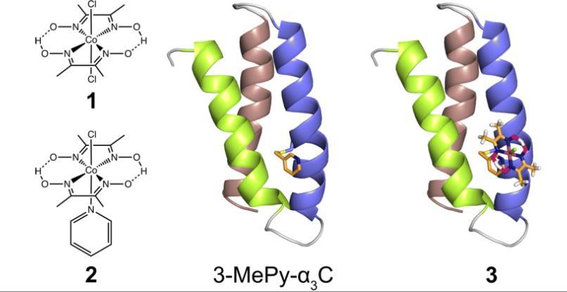 圖1、左:本研究中使用的鈷氧化肟:[Co(dmgH)2Cl2](1),和[Co(dmgH)2(py)Cl](2)。中心:基于相關(guān)蛋白系統(tǒng)2MP-α3 C(2MP=2-巰基酚),RSCB PDB ID 2LXY的3-MePy-α3 C(3-MePy=3-甲基吡啶)結(jié)構(gòu)模型。α3腳手架中的螺旋1、2和3分別以青檸綠、藍(lán)色和灰褐色呈現(xiàn)。右圖:基于3-MePy-α3C的人工氫化酶模型。
