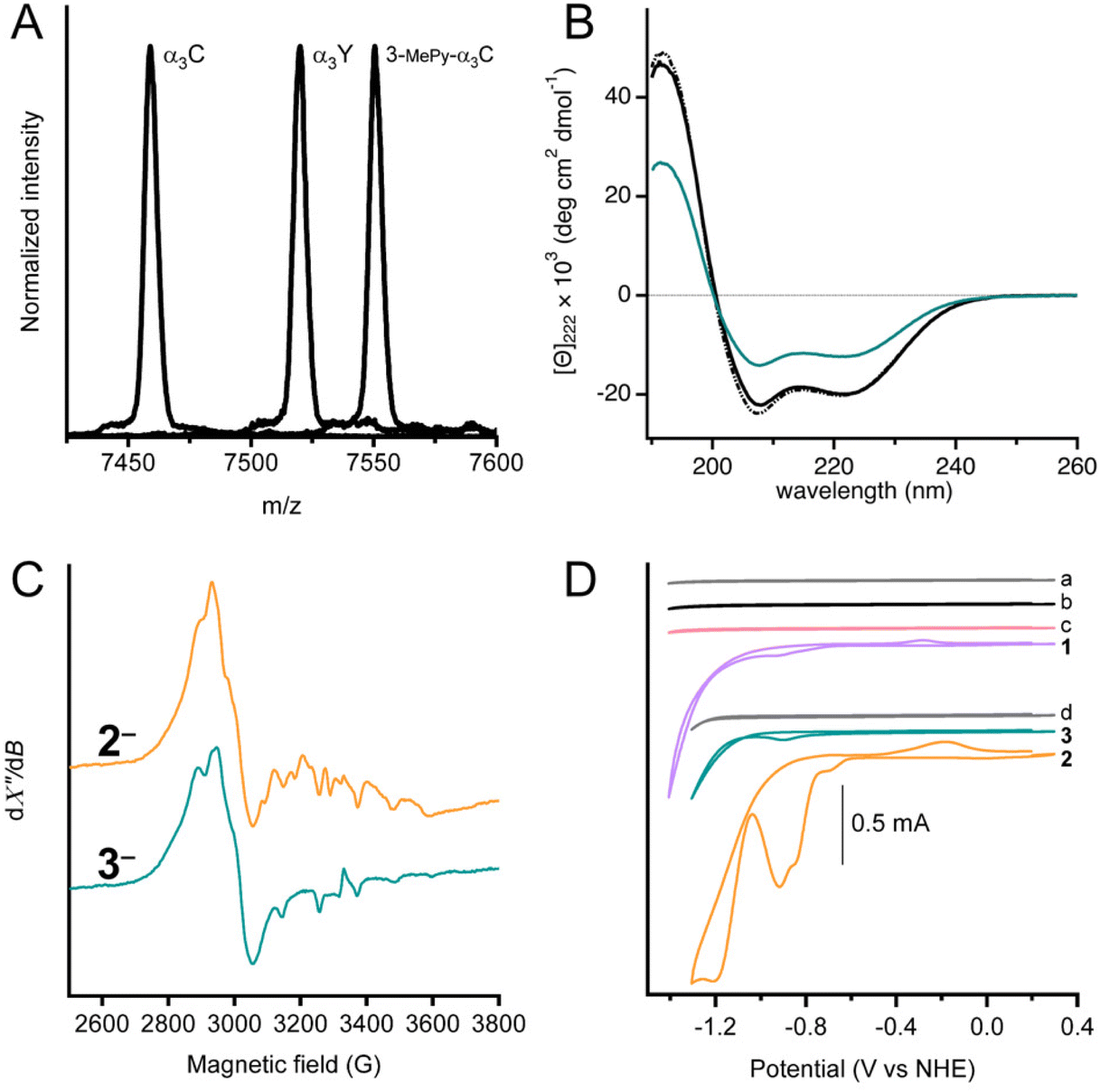 (D)堆疊的循環(huán)伏安圖,包括100 mM KP pH 7緩沖液(掃描A,灰色)、α3C蛋白膜(掃描b,黑色)、3-MePy-α3C蛋白膜(掃描c,粉色)、0.47 mM 1(掃描1,紫色)、100 mM MES、100 mM MOPS、75 mM KCl緩沖液(掃描D,灰色)、蛋白膜3(掃描3,青綠色)和1.0 mM 2蛋白膜(掃描2,橙色)。CVsa–c和CV1在100 mM KP、pH 7.0±0.1緩沖液中記錄。CVd、2和3采集于100 mM MES、100 mM MOPS pH 7.0緩沖液中。所有測(cè)量均采用250 mV s?1的掃描速率。
