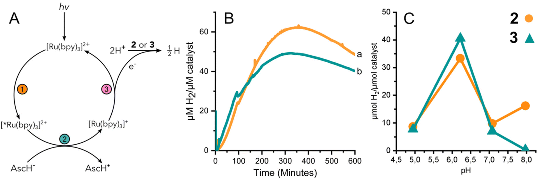 圖3(A)光激活HER的反應(yīng)方案。(B)H2由2(a,橙色)和3(b,青綠色)在光催化條件下pH 6.2產(chǎn)生。通過H2感應(yīng)電極檢測(cè)。(C)在反應(yīng)完備時(shí),在pH條件下的頭間檢測(cè)到H2。