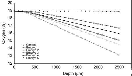 培養基中氧氣的溶解度(約9%鹽度和37.0°C)計算為200μmol/l。38.5°C時培養培養基中的擴散系數同樣計算為3.37×10?? cm2/s。單個胚胎呼吸速率以nl O?/胚胎每小時(nl/h)表示。