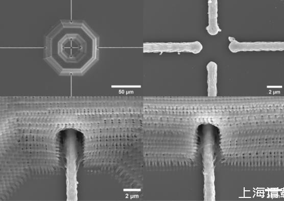 圖3是實施例1提供的三維集成化細胞電生理平臺中,激光直寫鉑線的三維微電極-微支架結構和鉑線從微支架底部預留凹槽穿越的微觀形貌照片;