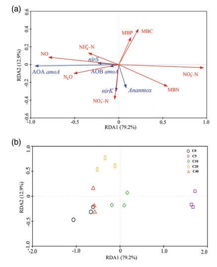 基于相關(guān)程度,選擇CAW改良后的土壤變量進行RDA,并匯總功能基因豐度。選定的土壤變量為MBC、MBN、MBP、NO??-N、NO??-N、NH??-N、NO和N?O。表S6(支持信息)給出了RDA前四個軸的特征值,按大小降序排列。前兩個軸分別解釋了基因豐度變異的79.2%和12.9%。RDA雙標圖表明,土壤特性的差異影響了CAW施用下氮轉(zhuǎn)化微生物功能基因的豐度。圖4(a)中紅色箭頭的長度表示每個土壤因子在解釋功能基因豐度方面的相對重要性,而箭頭之間的角度表示它們相關(guān)的程度。土壤NO??-N和NO與RD1關(guān)系密切,分別在該軸上具有最大正值和負值(分別為0.9632和-0.7954),而土壤MBC和NO??-N在RD2上分別具有最大正值和負值(分別為0.3976和-0.3890)。