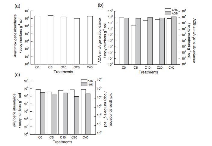 qPCR證實所有樣品中均存在厭氧氨氧化基因,其豐度為1.0-2.5 x 10?基因拷貝g?1干土。方差分析(ANOVA)顯示,對照與CAW改良土壤(5、10和40 g kg?1CAW)之間的厭氧氨氧化基因豐度無顯著差異,而在20 g kg?1CAW處理下基因豐度顯著降低。