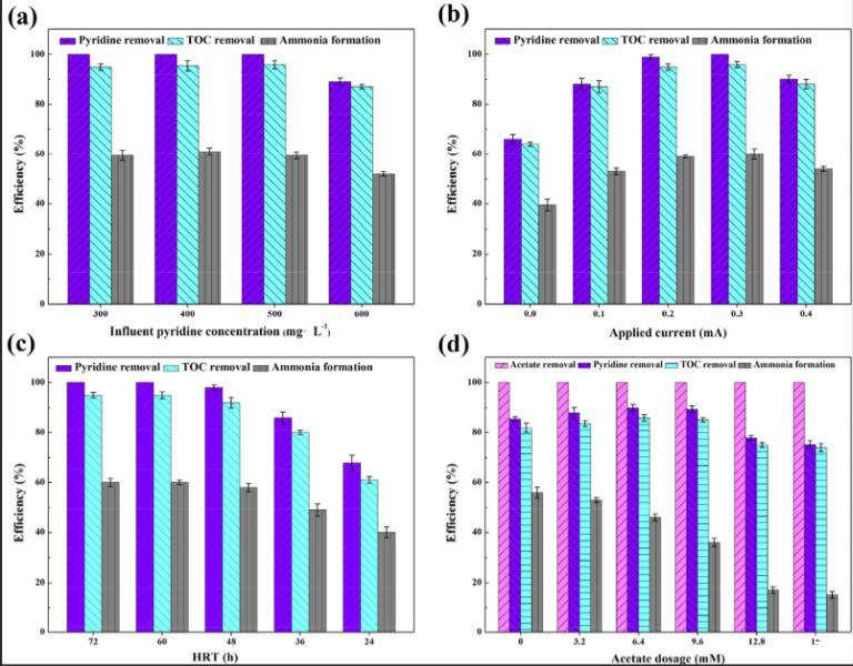 圖2. (a)吡啶濃度、(b)施加電流、(c)水力停留時(shí)間、(d)乙酸投加量對(duì)厭氧反應(yīng)器中吡啶降解、TOC去除及氨氮生成的影響