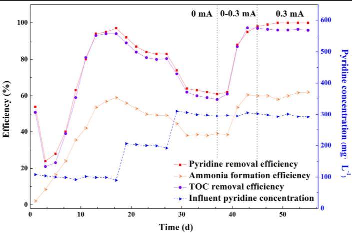 在啟動(dòng)期最初37天,無(wú)電流供應(yīng)下,厭氧反應(yīng)器中進(jìn)水濃度為100毫克/升時(shí),吡啶去除效率在前17天末高于95%(圖1)。然而,當(dāng)吡啶濃度增加至300毫克/升時(shí),僅約60%,表明高吡啶濃度對(duì)厭氧條件下其降解有負(fù)面影響。在38天提供小于0.3毫安的小電流后,陽(yáng)極電位從-244±4.5毫伏增加至-150±9.5毫伏,而陰極電位從-360±5.5毫伏降低至-800±15毫伏。有趣的是,吡啶去除和NH4-N形成效率顯著從61.1%和39.3%(37天無(wú)電流時(shí))增加至98.3%和60.7%(55天有電流時(shí))。純電解系統(tǒng)中吡啶去除效率僅為2.3±1.0%,表明小電流電解過(guò)程對(duì)吡啶的降解幾乎可忽略。NH4-N形成是吡啶環(huán)裂解的關(guān)鍵證據(jù),因?yàn)橄惹把芯勘砻鬟拎きh(huán)中的氮常在吡啶生物降解過(guò)程中轉(zhuǎn)化為NH4-N。然而,測(cè)得的NH4-N僅為吡啶中氮的60%,這可能是因?yàn)檫拎そ到猱a(chǎn)生的大部分NH4-N用于生物質(zhì)合成。此外,電流供應(yīng)后超過(guò)95%的TOC被去除,而厭氧條件下僅約57%的TOC被去除,表明電流刺激下厭氧條件下吡啶幾乎完全礦化。先前研究表明,電化學(xué)刺激可通過(guò)提供電極作為陽(yáng)極電子受體或陰極電子供體加速有機(jī)污染物的降解。例如,電化學(xué)刺激可增強(qiáng)洛克沙胂生物降解和礦化為無(wú)機(jī)砷,促進(jìn)通過(guò)物理化學(xué)處理廢水去除砷。值得注意的是,微生物電子轉(zhuǎn)移對(duì)于電化學(xué)刺激過(guò)程中洛克沙胂降解至關(guān)重要。在本研究中,厭氧系統(tǒng)中的陽(yáng)極在吡啶降解中起關(guān)鍵作用,因?yàn)檫拎さ挚刮⑸镞€原降解但更容易在陽(yáng)極氧化降解中屈服。此外,在處理吡啶污染物時(shí),電極可對(duì)微生物提供連續(xù)和精細(xì)的刺激。