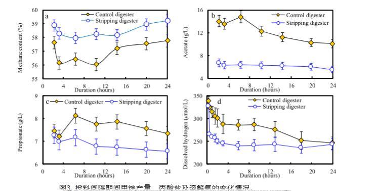 兩個消化器的過程性能如表2所示。對照消化器和剝離消化器中的總銨態氮濃度分別為6.8和5.8 g/L。通常,氨/銨抑制反映在揮發性脂肪酸積累和甲烷產率降低,發生在總銨態氮3-5 g/L。在本研究中,兩個消化器均觀察到揮發性脂肪酸積累,然而,剝離消化器中的揮發性脂肪酸濃度僅為對照消化器的70%。