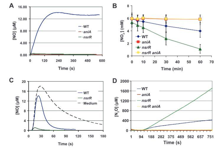 在初步實驗中,M.catarrhalis O35E nsrR突變體產生的N?O水平遠高于其親本菌株;具體而言,nsrR突變體在大約50分鐘內從5 mM NaNO?產生了2.5 mM N?O,而野生型親本菌株在相同時間內僅產生約0.4 mM N?O。正如預期,失活aniA基因導致O35E aniA突變體和O35EΔnsrR aniA突變體均無法從亞硝酸鹽檢測到N?O的產生(圖7D)。