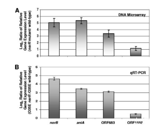 圖5.NsrR調控的卡他莫拉菌基因鑒定。(A)對野生型菌株O35E、7169和ETSU-9及其nsrR突變株提取的總RNA進行DNA微陣列分析,方法詳見材料與方法部分。圖中顯示在所有三種nsrR突變株中持續上調至少兩倍(P<0.002)的基因數據。誤差棒表示標準差。(B)菌株O35E的nsrR突變細胞與野生型細胞中norB、aniA、MC ORF 683和MC ORF 1550表達相對水平的qRT-PCR分析。qRT-PCR測量的內參對照為MC ORF 1234(62)的表達。誤差棒指示最大和最小相對表達水平。