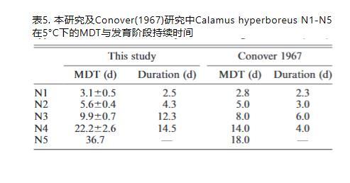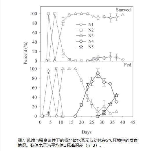 在40天的實驗期間,投喂處理中的無節幼體發育到N5,而在饑餓處理中,發育通常停滯在N3。