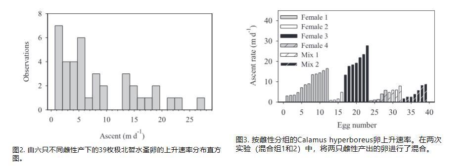 記錄到的平均上升速率為8.6 ± 7.1米/天。然而,如標準差所示,個體速率變化很大,范圍從0.7到27.7米/天,中位數為5.6米/天。總體而言,上升速率在同一卵塊內和不同雌體之間都有變化。雌體3主要產生快速卵,上升速率為20.2 ± 5.6米/天;雌體2和4主要產生慢速卵,上升速率為2.3 ± 2.0米/天;而雌體1既產生快速卵也產生慢速卵,上升速率范圍從3到16.5米/天。觀察到的上升速率差異在雌體3與雌體2、4以及混合2之間是顯著的。卵密度在1.0006和1.0268 g cm?3之間變化,平均為1.0194 ± 0.0063 g cm?3。