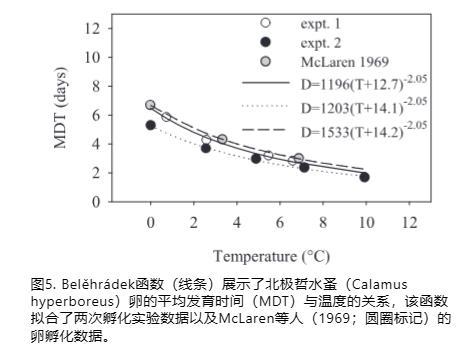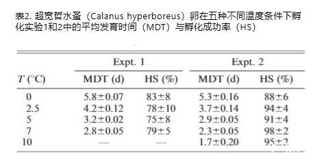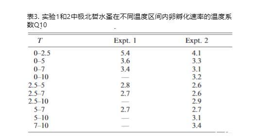 總的來說,兩個實驗中卵的孵化成功率都很高,實驗1在75%到83%之間,實驗2在88%到98%之間。實驗1中0-7°C下卵的平均發育時間在5.8到2.8天之間,實驗2中0-10°C下在5.3到1.7天之間,兩個實驗中溫度的影響均顯著。盡管實驗2的溫度略低,但在所有溫度下卵孵化都顯著快于實驗1。為兩個實驗中不同溫度區間計算的溫度系數Q10在2.6到5.4之間,其中從0°C到2.5°C的值最高。應用Belěhrádek函數對數據進行了顯著擬合,兩個實驗中r2 > 0.99。