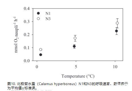 呼吸速率隨溫度和發育階段升高而增加(圖10)。溫度(p<0.001)與發育階段(p=0.05)對呼吸速率的影響顯著,且在5°C時不同發育階段間的差異具有統計學意義(雙因素方差分析,經Holm-Sidak多重比較檢驗)。計算得到不同溫度區間的Q10值較高,范圍在2.6至7.8之間(表7)。在0-10°C條件下,覆蓋基礎代謝的最低碳需求經計算分別為N1期個體體重的1.8-8.8%和N3期個體體重的3.9-12.8%(表7)。