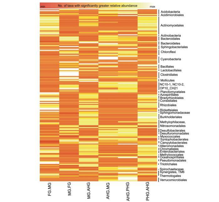 需氧類群如放線菌目(Actinomycetales)、伯克霍爾德菌目(Burkholderiales)、根瘤菌目(Rhizobiales)、著色菌目(Chromatiales)、固氮螺菌目(Azospirillales)、慢生根瘤菌目(Bradyrhizobiales)和亞硝化單胞菌目(Nitrosomonadales)在腸道的兩端(FG和PHG)富集,而在中央區域(MG和AHG)豐度較低。厭氧細菌類群包括擬桿菌目(Bacteroidales)、梭菌目(Clostridiales)、螺旋體目(Spirochaetales)、脫硫桿菌目(Desulfobacterales)、脫硫單胞菌目(Desulfomonadales)、互營桿菌目(Syntrophobacterales)和熱袍菌目(Thermotogales),相對于MG和PHG,在AHG中富集。產甲烷菌,包括甲烷微菌科(Methanomicrobiaceae)、甲烷螺菌科(Methanospirillaceae)和甲烷八疊球菌科(Methanosarcinaceae),僅在AHG中檢測到(圖6a和b)。