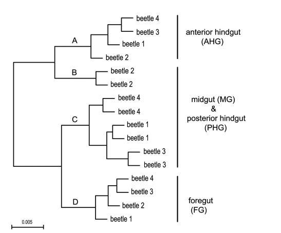 通過454焦磷酸測序16S rRNA基因V9區域也評估了與黑蜣科甲蟲不同區域相關的微生物群落。該分析證實了PhyloChip獲得的結果,即微生物類群的分布,即需氧細菌在FG和PHG中更豐富,厭氧細菌在AHG和MG中占主導地位,并且AHG棲息著產甲烷古菌。群落β多樣性的UPGMA(非加權配對算術平均法)聚類顯示出與PhyloChip相似的聚類模式,FG和AHG聚類在分化良好的進化枝中,而MG和PHG聚集在一起,但主要根據甲蟲而不是腸道區域進行聚類,正如PhyloChip分析所觀察到的那樣。