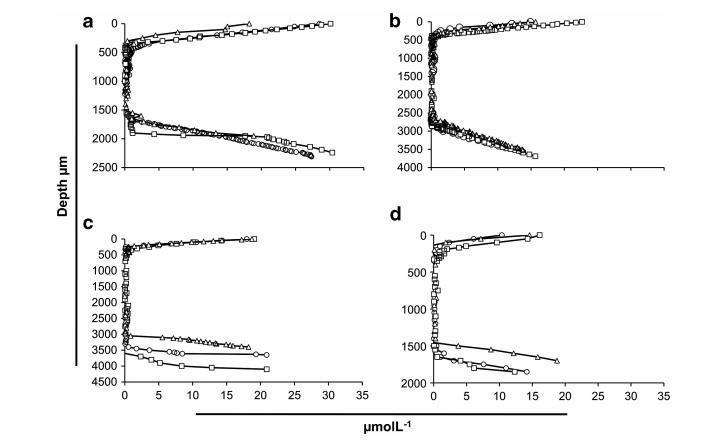 黑蜣科甲蟲腸道呈現出一組復雜的微環境,因為存在至少四個形態上不同的區域(圖1b)。為了更好地理解微生物組成或活性的任何區室化,使用微電極測量了每個腸道區域內不同位置的O2分布(圖2)。在每次測量期間,使用顯微操縱器將尖端驅動到腸道壁表面,并使用數字顯微鏡進行監控,并將其保持在該位置,直到測量到穩態的O2讀數(約1分鐘)。在每種情況下,一旦電極尖端穿透腸道壁,氧氣濃度迅速下降,出現陡峭的梯度,直到觀察到氧氣完全耗盡。厭氧區域不僅在AHG中,而且在所有四個腸道區域中都占據了體積優勢(圖2)。