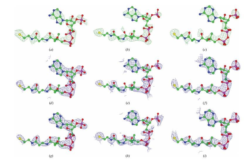 以球棍模型展示的單體B(a、d、g)、D(b、e、h)和F(c、f、i)的輔酶A基團(原子顏色編碼如下:碳,綠色;氧,紅色;磷,品紅色;氮,藍色;硫,黃色)分別擬合于:(上排)FoFc差值傅里葉OMIT圖(綠色網格;等值線水平3.0,未含底物計算);(中排)2FoFc差值傅里葉圖(藍色網格;等值線水平1.0,使用phenix軟件計算, Adams 等,2010);(下排)2FoFc差值傅里葉圖(藍色網格;等值線水平2.0,采用phenix的‘特征增強’選項)。