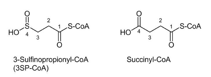 來自 Desulfococcus multivorans 的戊二酰輔酶 A 脫氫酶與戊二酰輔酶 A 復合物的結構,以及來自豬肝線粒體的中鏈酰基輔酶 A 脫氫酶與辛酰輔酶 A 復合物的結構,與 Acd_DPN7 3SP-CoA 脫亞磺酰酶結構的疊加表明,圍繞殘基 Arg84、Asp88、Lys118-Ile121、Tyr243-Gln246 和 FAD 異咯嗪環的空腔可能是 Acd_DPN7 3SP-CoA 脫亞磺酰酶的反應中心。為了驗證這一假設,Acd_DPN7 在存在琥珀酰輔酶 A 的情況下結晶,琥珀酰輔酶 A 代表了 3-亞磺酰丙酰輔酶 A (3SP-CoA) 的結構類似物。琥珀酰部分的 C 原子編號為 1-4,位置 4 對應于末端羧酸鹽。在 3SP-CoA 中,位置 4 對應于末端亞磺酰基(圖 3)。共結晶,隨后浸泡琥珀酰輔酶 A,導致琥珀酰輔酶 A 水解。正如 Wischgoll 等人報道的那樣,抑制二羧酸輔酶 A 硫酯的水解是共結晶的主要挑戰,因為從大多數數據集計算的電子密度僅包含輔酶 A。