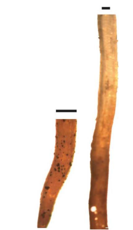 圖6鐵蝕斑完全覆蓋Lobelia dortmanna根尖(左)和部分根表面(右)。比例尺:300微米。
