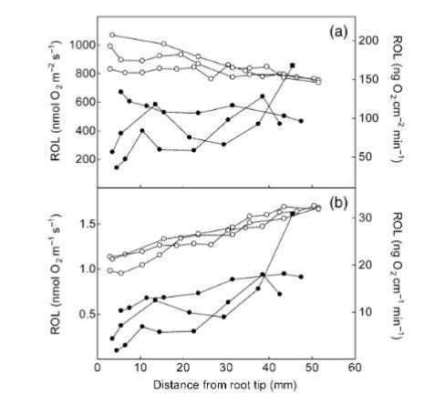 圖3使用根套筒電極沿三條有(實心圓)或無(空心圓)鐵蝕斑的Lobelia dortmanna根長度測量的徑向氧損失(ROL)。其中一個根的最基部某點(實心方塊)在其余部分完全覆蓋鐵蝕斑的情況下無鐵蝕斑。(a)中速率以nmol O?m?2根表面積s?1表示,(b)中以nmol O?m?1根長度s?1表示,均為距根尖距離的函數。測量期間,根浸沒在去氧瓊脂中,且根腔隙基部暴露于大氣。