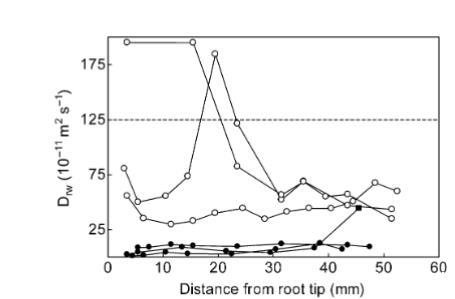 圖5三條有(實心圓)和無(空心圓)鐵蝕斑的Lobelia dortmanna根壁擴散系數(Drw)沿根長度的變化。其中一個根的最基部某點(實心方塊)在其余部分完全覆蓋鐵蝕斑的情況下無鐵蝕斑。水平虛線表示3.5°C時氧氣在水中的擴散系數。