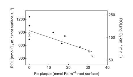 圖7來自六個完整根系(實心圓)和六個單根(空心圓)的Lobelia dortmanna根表面徑向氧損失(ROL)與鐵膜(Fe-plaque)量的關系(n=1)。